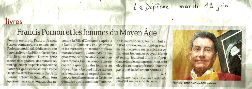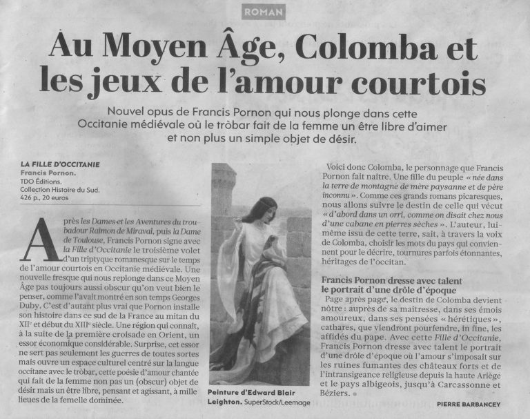 « Les dames et les aventures du troubadour Raimon de Miraval, de l’écrivain et poète toulousain Francis Pornon, raconte « la première renaissance européenne des lettres et de l’amour » à travers la destinée du poète itinérant Raimon de Miraval qui exerça son art à la cour des personnages parmi les plus importants du Moyen-âge, des vicomtes Trencavel aux rois d’Aragon. Amoureux des femmes et des mots, ce poète entraîne le lecteur sur les routes de Carcassonne, Toulouse, Narbonne et jusqu’à Barcelone. »