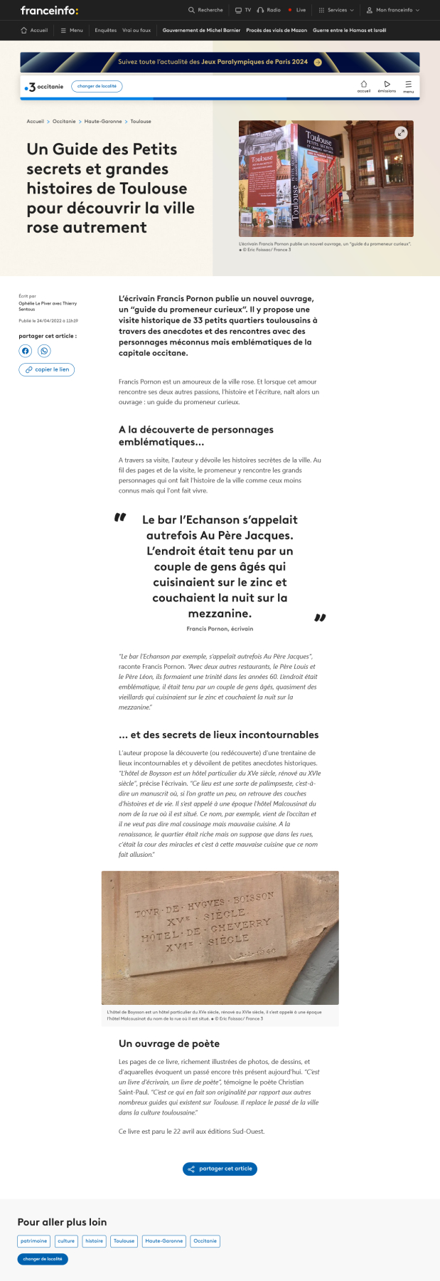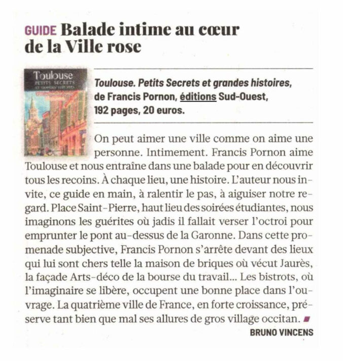 Le magazine Boudu conseille à ses lecteurs Toulouse, petits secrets et grandes histoires, de Francis Pornon : lire l’article sur le site du magazine.