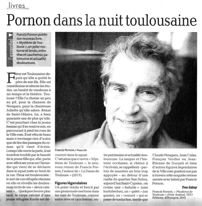 « Avec « Toulouse Barbare » Francis Pornon signe son second polar (« Saône Interdite » le Poulpe était son premier) et force est de constater que la réussite est au rendez-vous, tant il nous tient en haleine jusqu’au dénouement, barbare comme il se doit. »