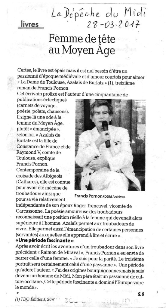 LA DAME DE TOULOUSE, article sur La Dépêche (28/03/2017) : 30/10/2017 / Francis Pornon A propos de mon nouveau roman : La Dame de Toulouse.