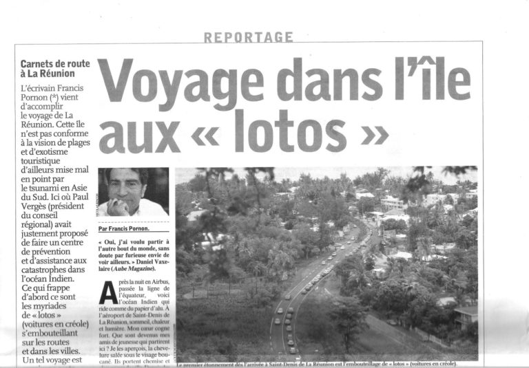 « Voyage dans l’île aux lotos », L’Humanité hebdo, 22 et 23 janvier 2005 07/03/2022 / Admin Ecrits de Francis dans la presse Previous post « Mémoire ouverte », L’Humanité, 10 novembre 1999 Next post « Voyage en Tunisie », Gibraltar fin 2013